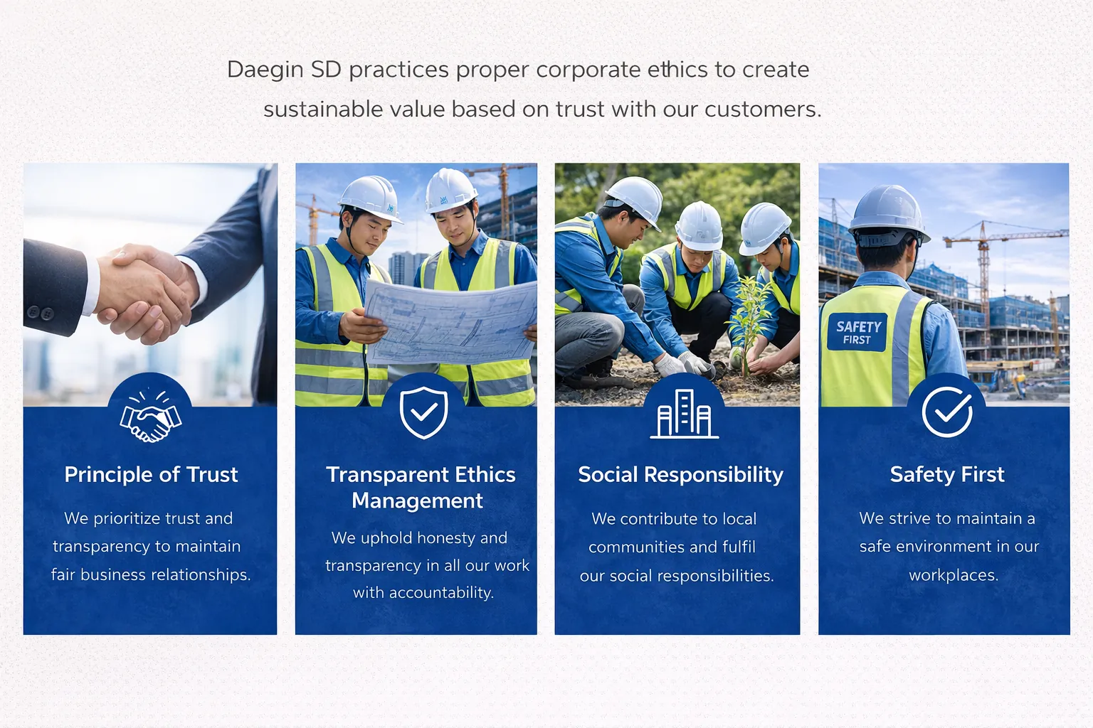 지속 가능한 건설 기술과 혁신을 통해 미래 도시를 설계하며 고객의 신뢰를 최우선으로 생각합니다. 글로벌 수준의 경쟁력을 갖춘 건설사로 도약합니다.